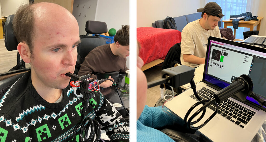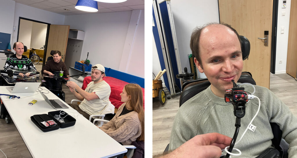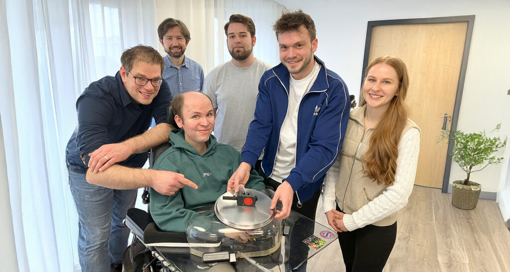 Ein weiteres innovatives Kooperationsprojekt mit dem Hochschulcamps Tuttlingen hat von Oktober 2025 bis Februar 2026 stattgefunden. Drei Studierende aus dem Master-Studiengang „Human Factor“ machten sich auf die Reise, um für Menschen mit eingeschränkten Freiheitsgraden eine intuitive Maus-Steuerung zu entwickeln. Herausgekommen ist ein Sip- und Puff-Mauscontroller. Durch Pusten und Ziehen können Rechts-Klicks, Links-Klicks und Doppelklicks ausgelöst werden. Das Mundstück ist zudem gleichzeitig ein Joystick, der nun vereinfachtes Scrolling ermöglicht. Diese Funktionen werden in unserem Fall mit dem Joystick des E-Rollstuhlst kombiniert, die Mundmaus ist aber auch autark funktionsfähig. Das Ergebnis fußt auf einem iterativen, menschzentrierten Gestaltungsprozess. Am 6. Februar 2026 wurde das neue Interface „auf dem Silbertablett“ übergeben.